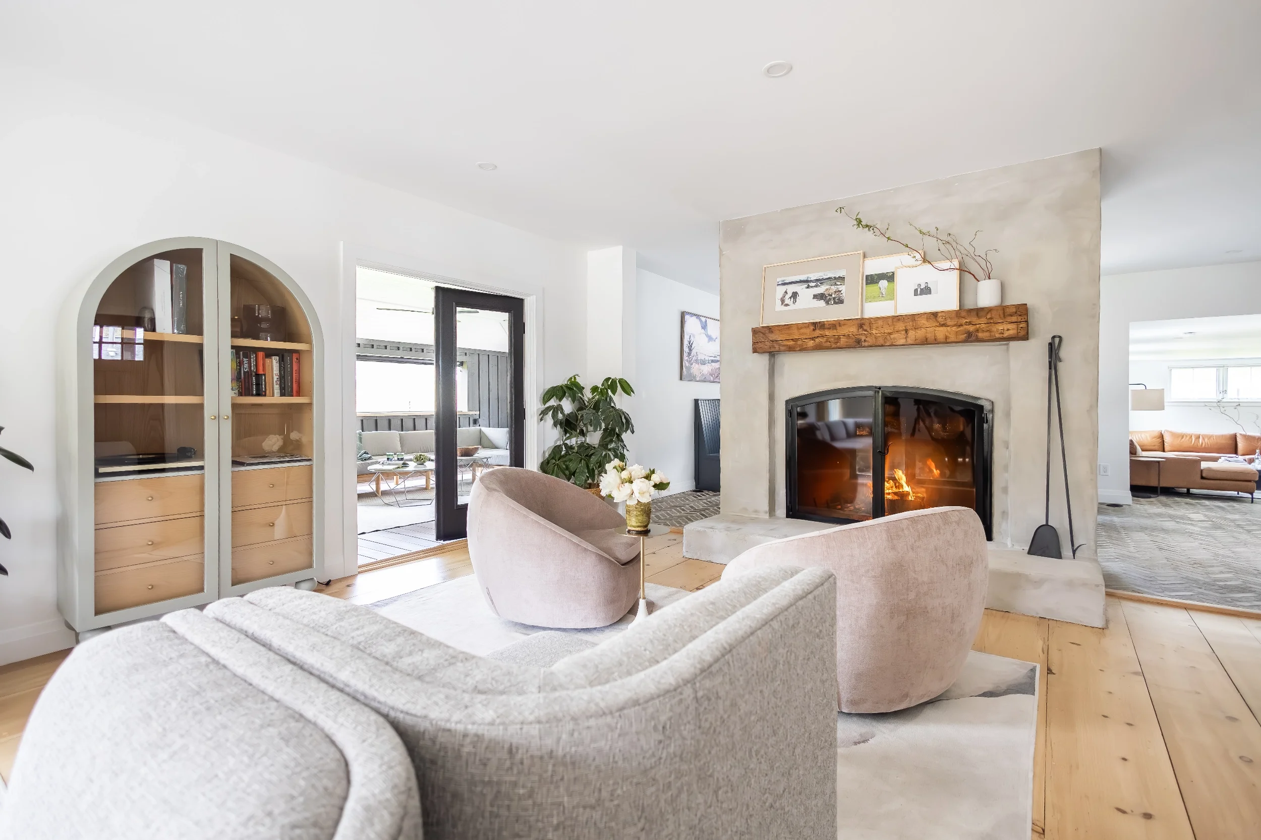 Together, we transformed the first floor into a spacious and inviting area anchored by a two-sided fireplace that separates the living room and eat-in kitchen. The wide pine floors in the main living area are bathed in natural light, creating a welcoming atmosphere. A secondary living room was repurposed into a veranda and a sunken TV room was created off the mudroom for a laid-back lounge area.